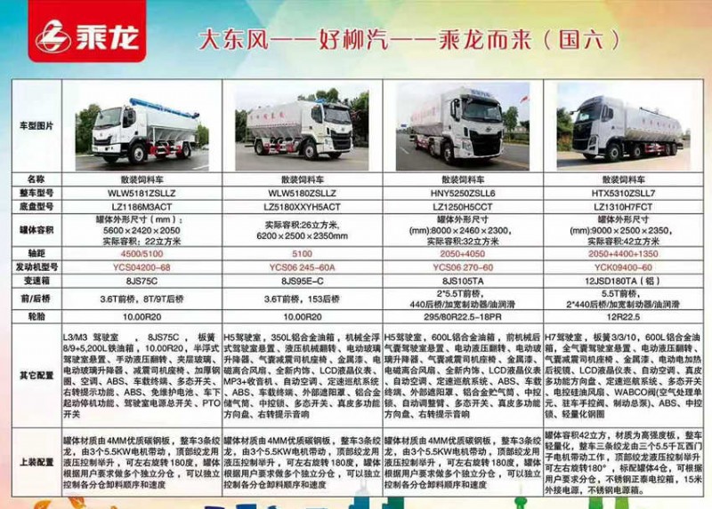 柳汽前四后八散裝飼料運輸車,公告型號;HTX5310ZSLL7,HYS5310ZSLL6。底盤型號:LZ1310H7FCT,5.5T前橋,2*440后橋/4.444/加寬制動器/油潤滑,軸距2050+4400+1350,H73D駕駛室,YCK09400-60,12JSD180TA(鋁),Ф430拉式離合,板簧3/3/10,282(8)車架,600L鋁合金油箱,12R22.5,全氣囊駕駛室懸置、電動液壓翻轉、夾層玻璃、電動玻璃升降器、氣囊減震司機座椅、金屬漆、電動電加熱后視鏡、LCD液晶儀表、MP3+收音機、自動空調、真皮多功能方向盤、定速巡航系統、多態開關、電控硅油風扇、WABCO閥(空氣處理單元、駐車手控閥、制動總泵)、鋁合金貯氣筒、ABS、中控鎖、自動調整臂、右轉提示音響、165AH電瓶、輕量化鋼圈。(3480)