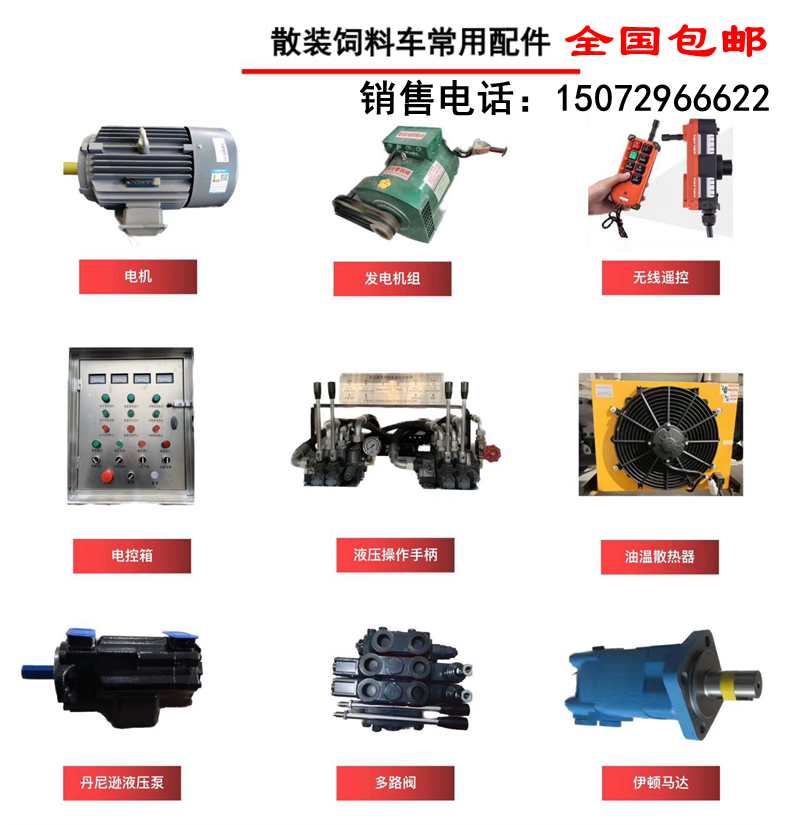 程力散裝飼料車配件主要有:電機、發電機組、無線遙控器、電控箱、液壓操作手柄、油溫散熱器、液壓泵、多路閥、馬達等。本公司專業制造各種散裝飼料車,并為廣大客戶提供各種散裝飼料車配件和售后服務,聯系電話:15072966622.